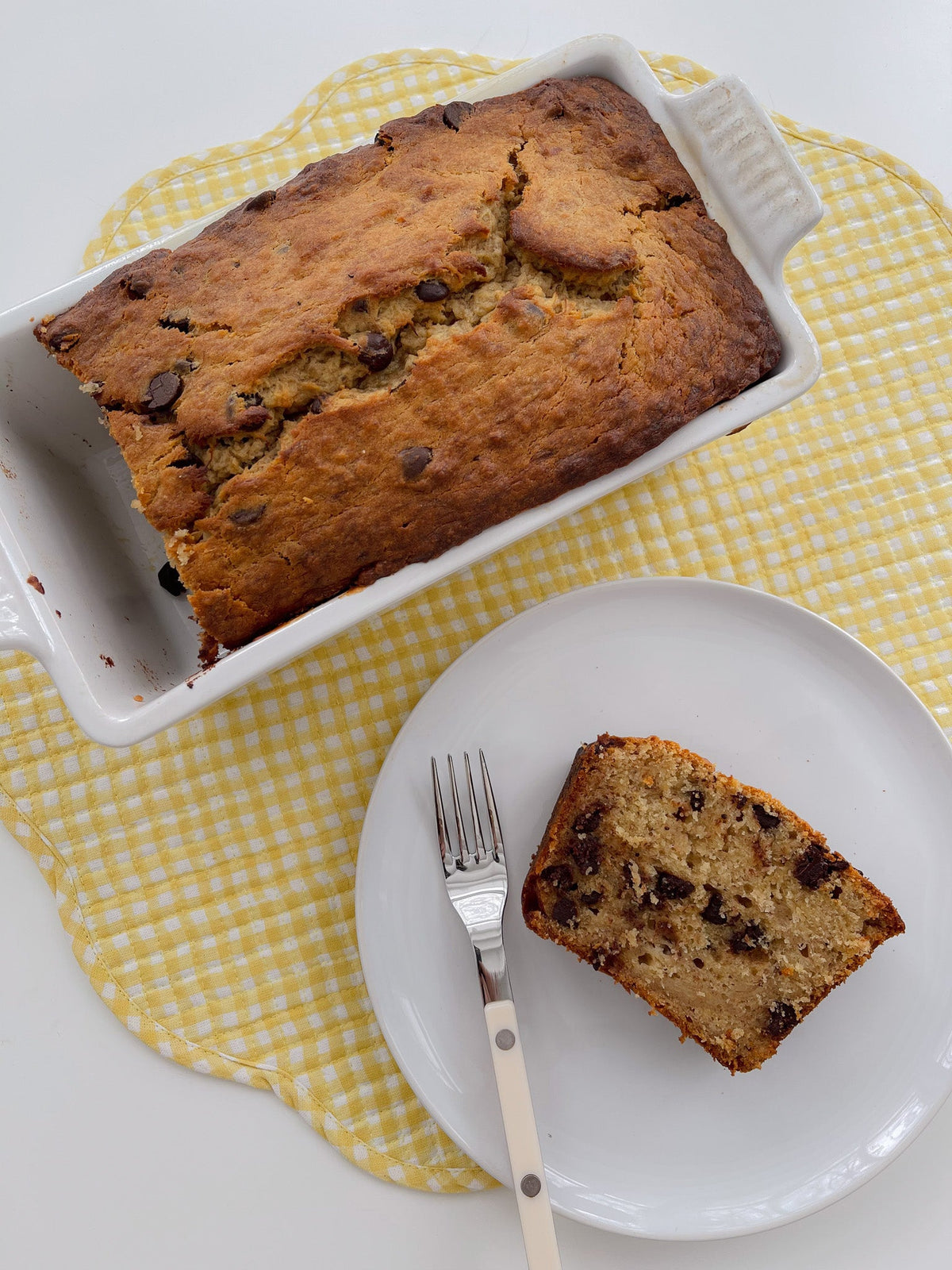 Stir dry ingredients together in a separate bowl. Add flour mixture into wet mixture until just combined. Fold in chocolate chips. Pour into prepared loaf pan.