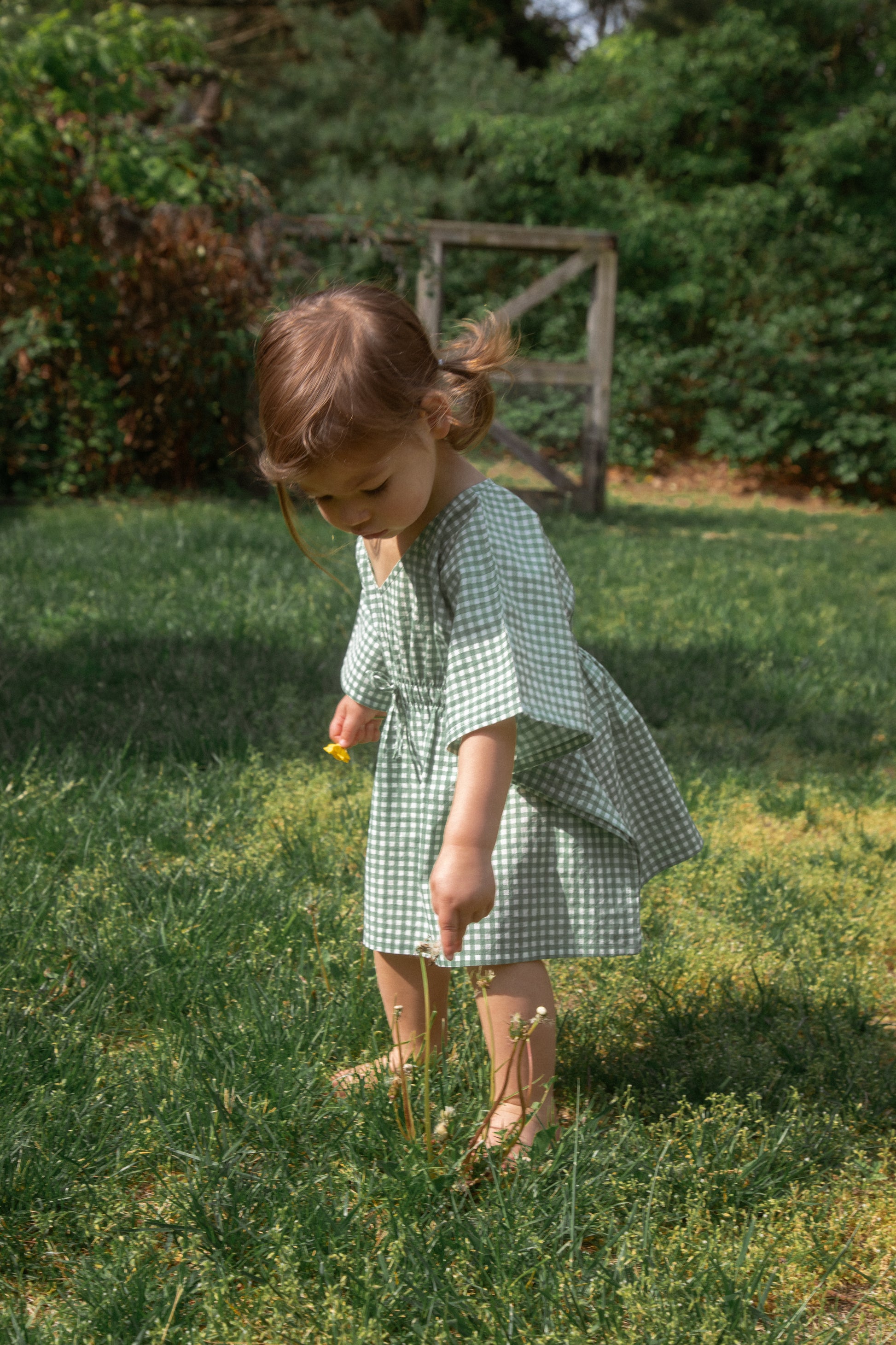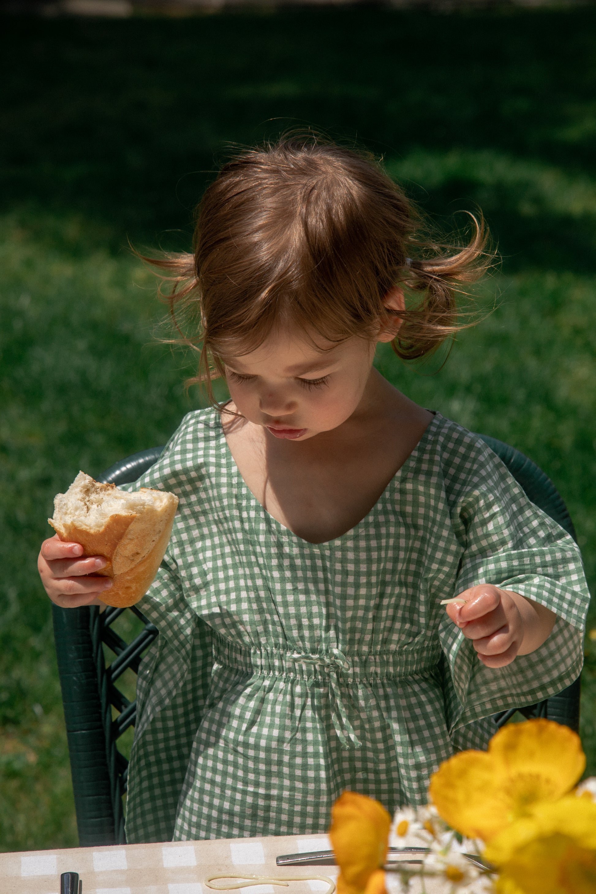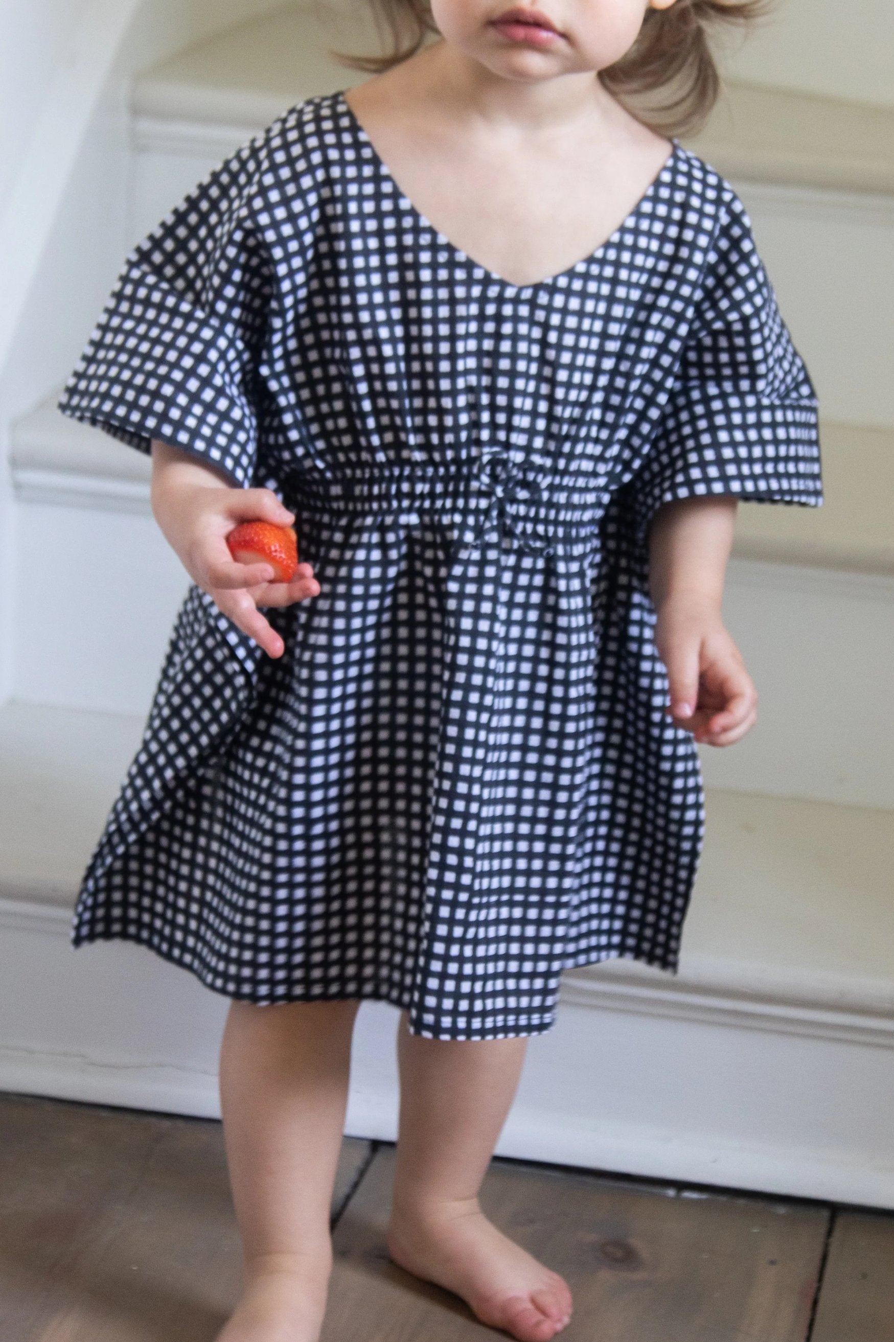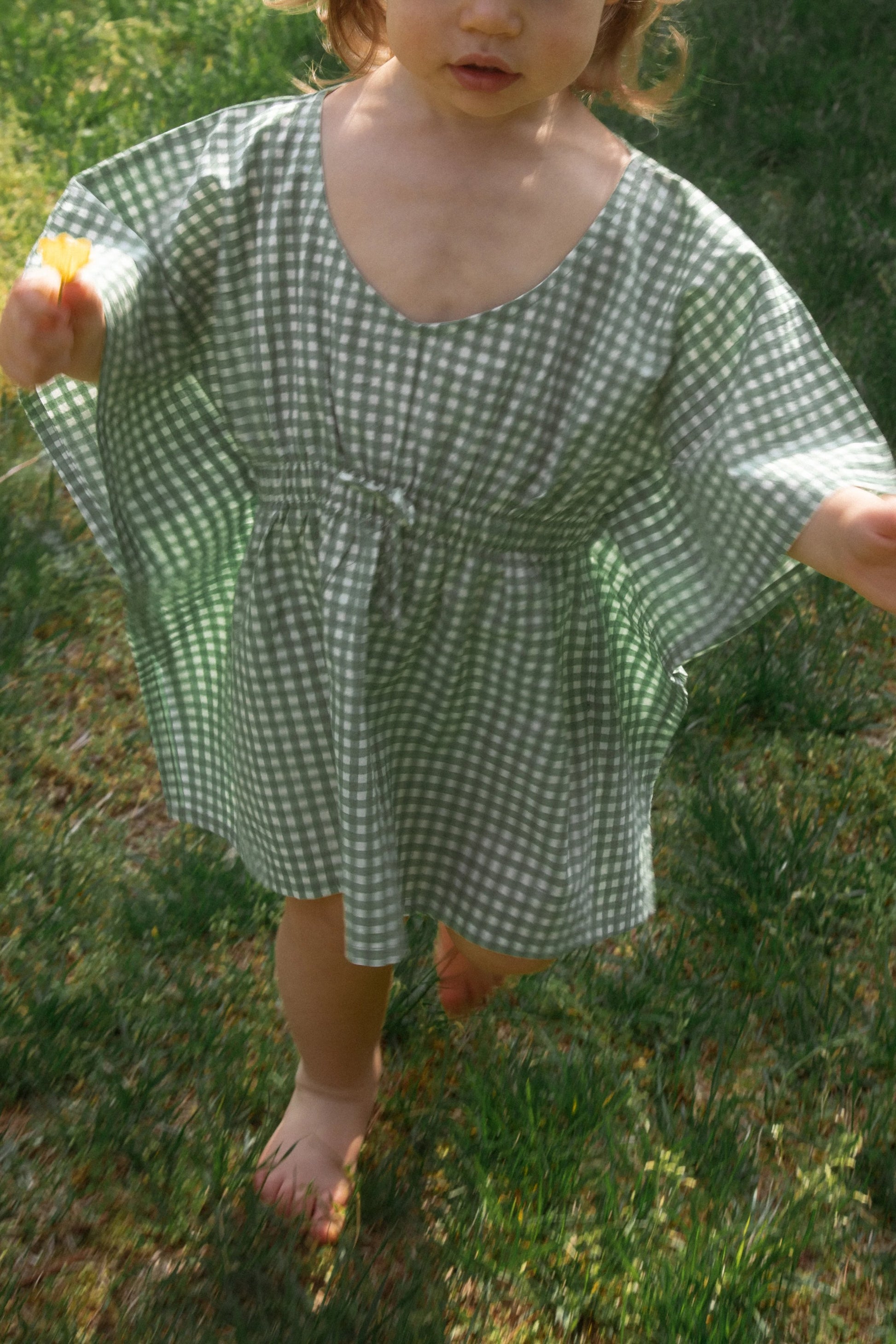 A matching caftan for your mini. Our signature block-printed gingham has been applied by hand using natural dyes to the finest organic cotton for a designer frock she'll be able to wear for years to come, thanks to our flexible sizing. The Bella Caftan is a multi-purpose toddler dress suitable for everything from afternoon play dates to birthday parties or brunch with the fam.