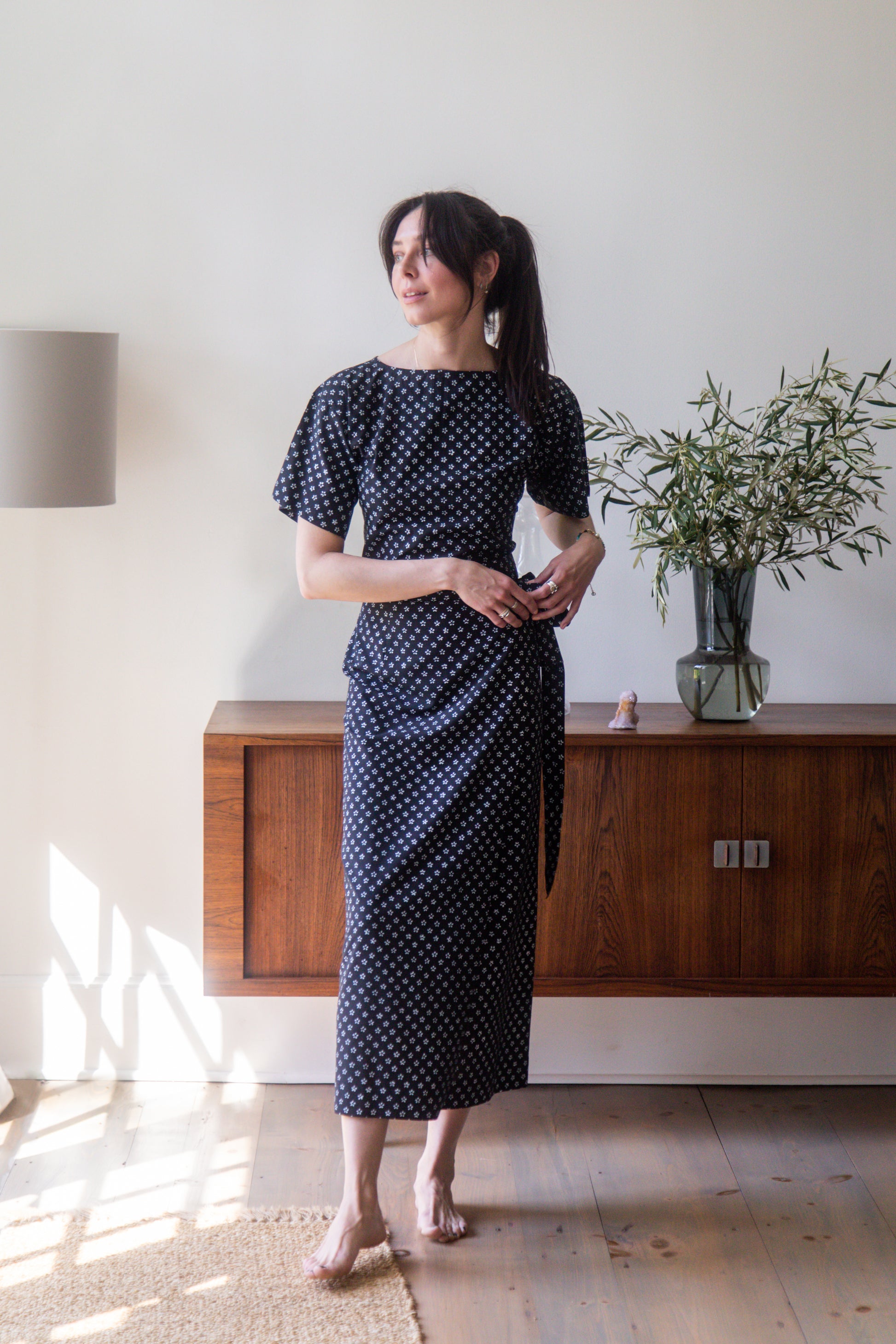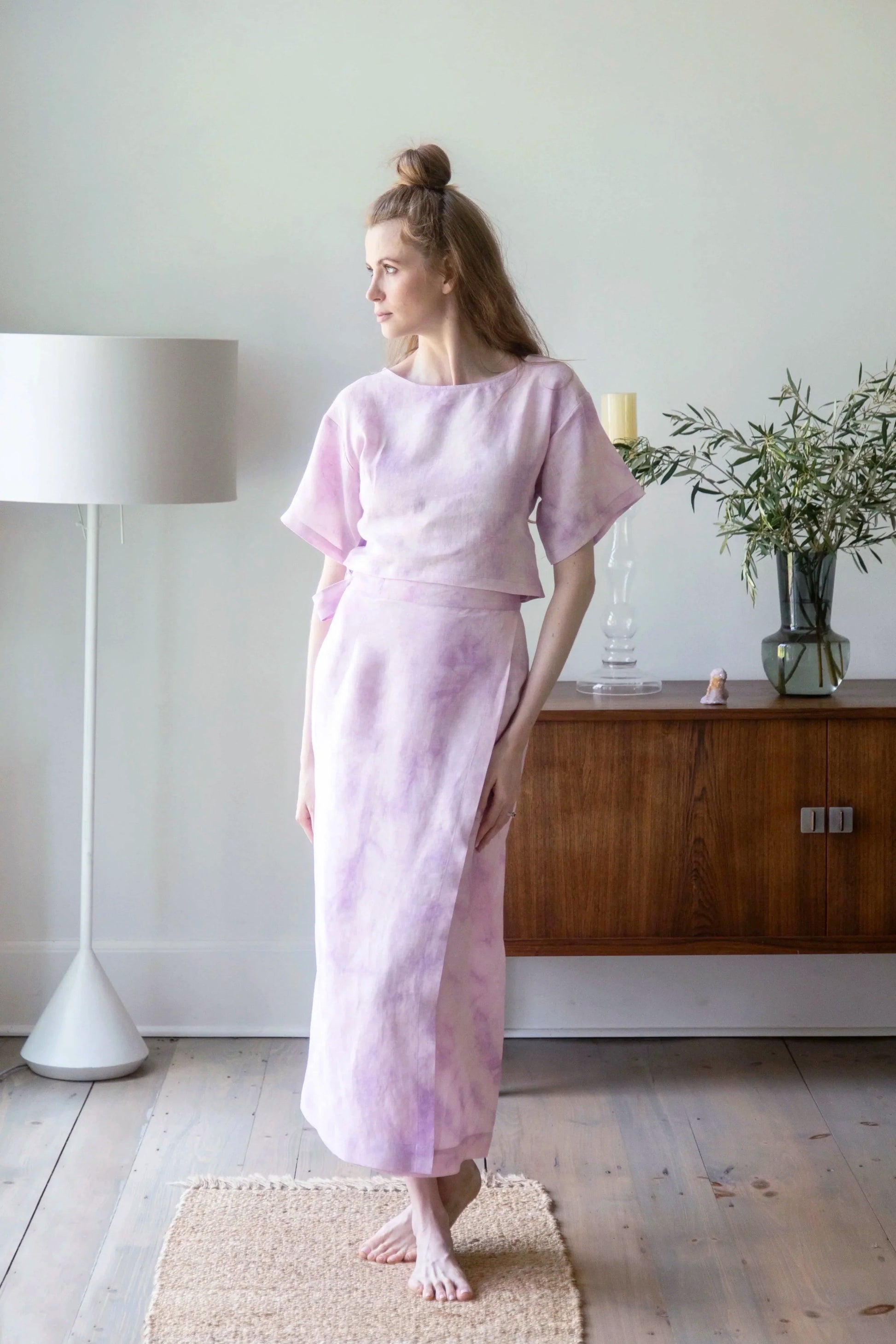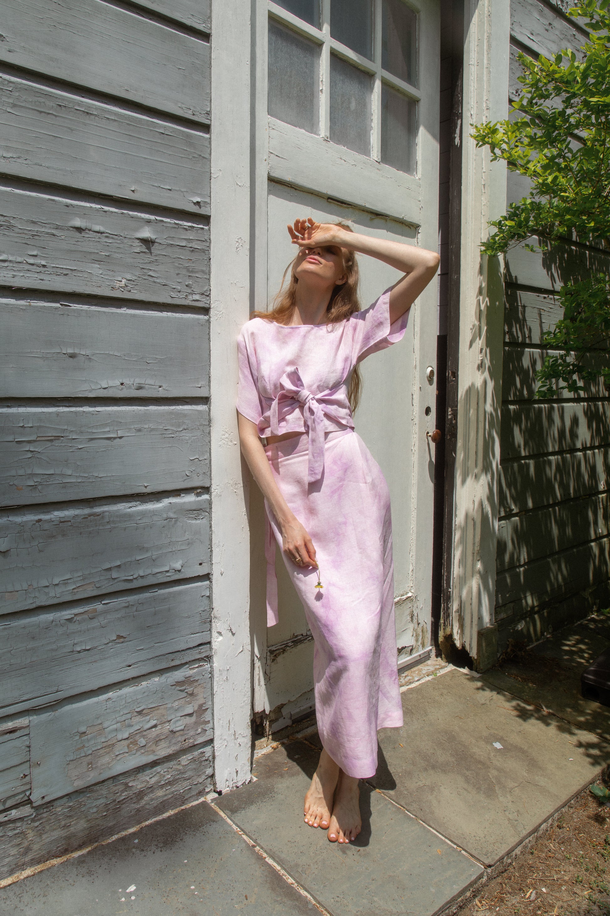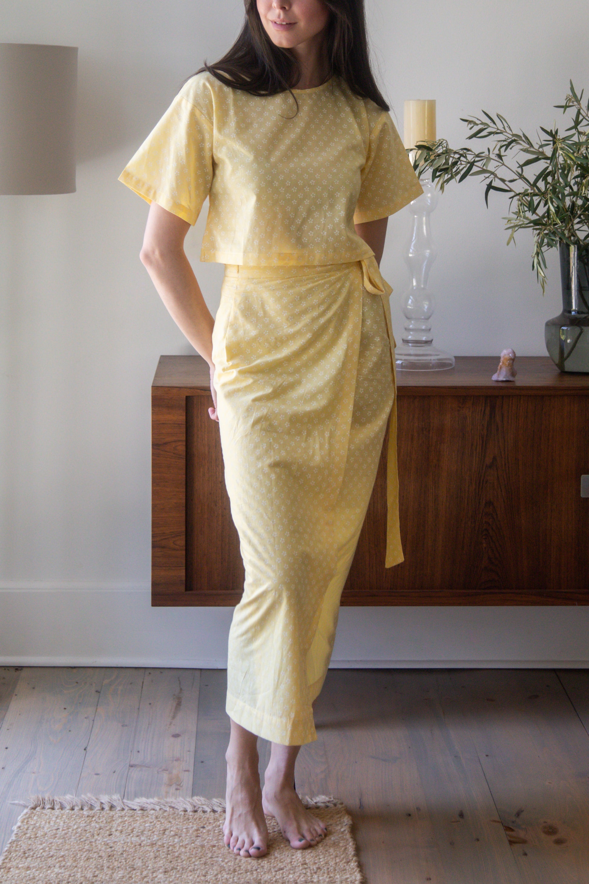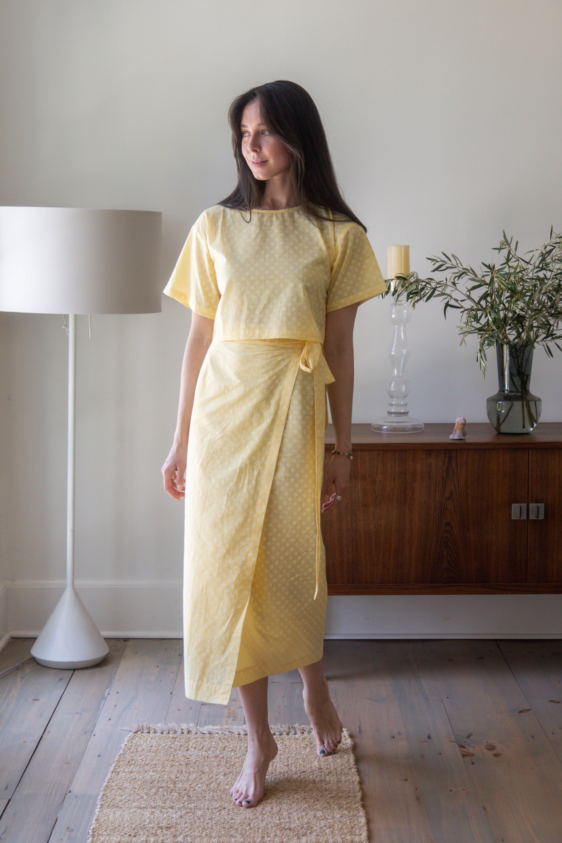 The wrap skirt is inspired by the chic look of a sarong at midi-length, creating a slimming column shape that flatters every-body. You'll love that the flexible sizing moves and evolves with your body. The top has a slight crop that ties in the front or the back, creating two entirely different looks.