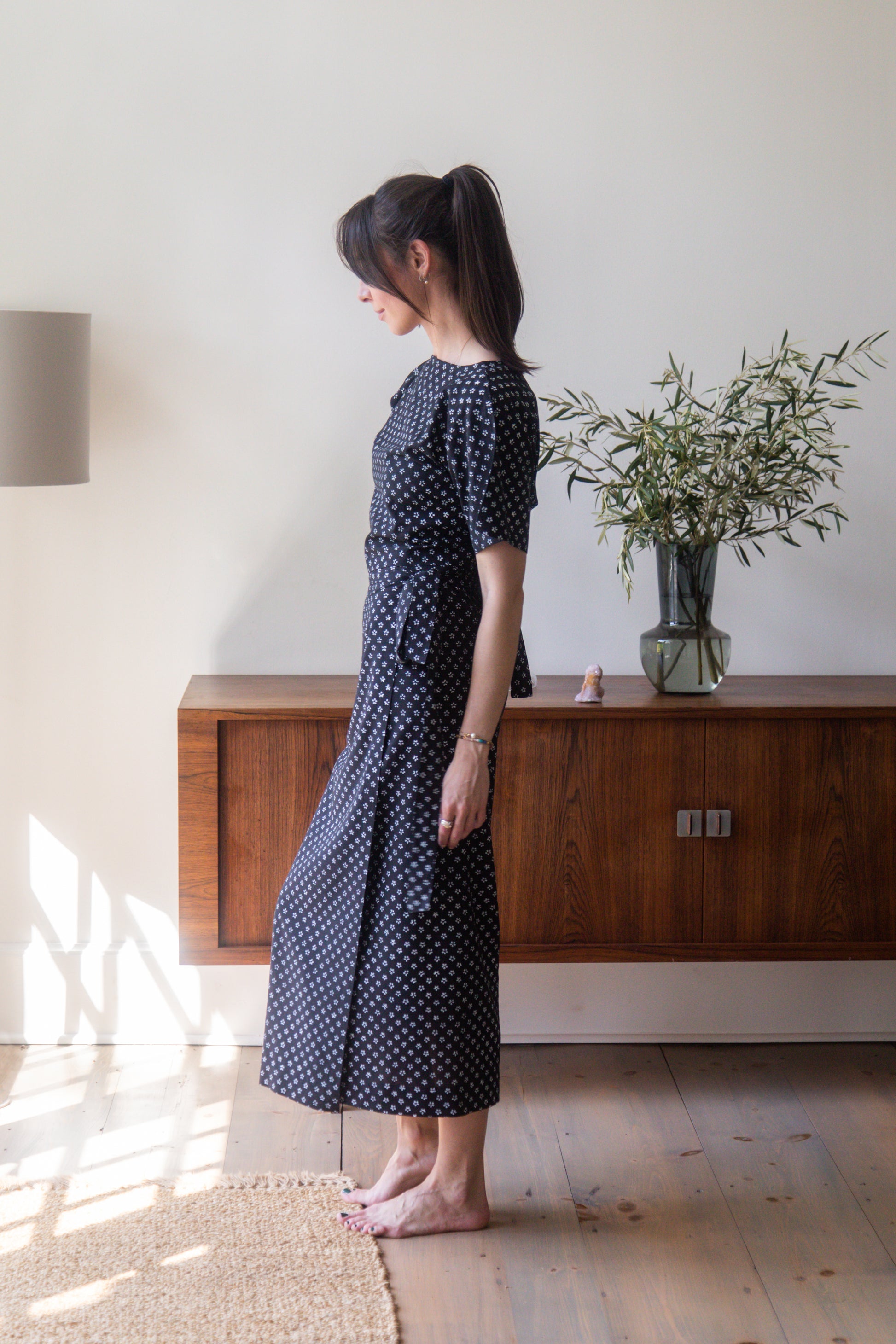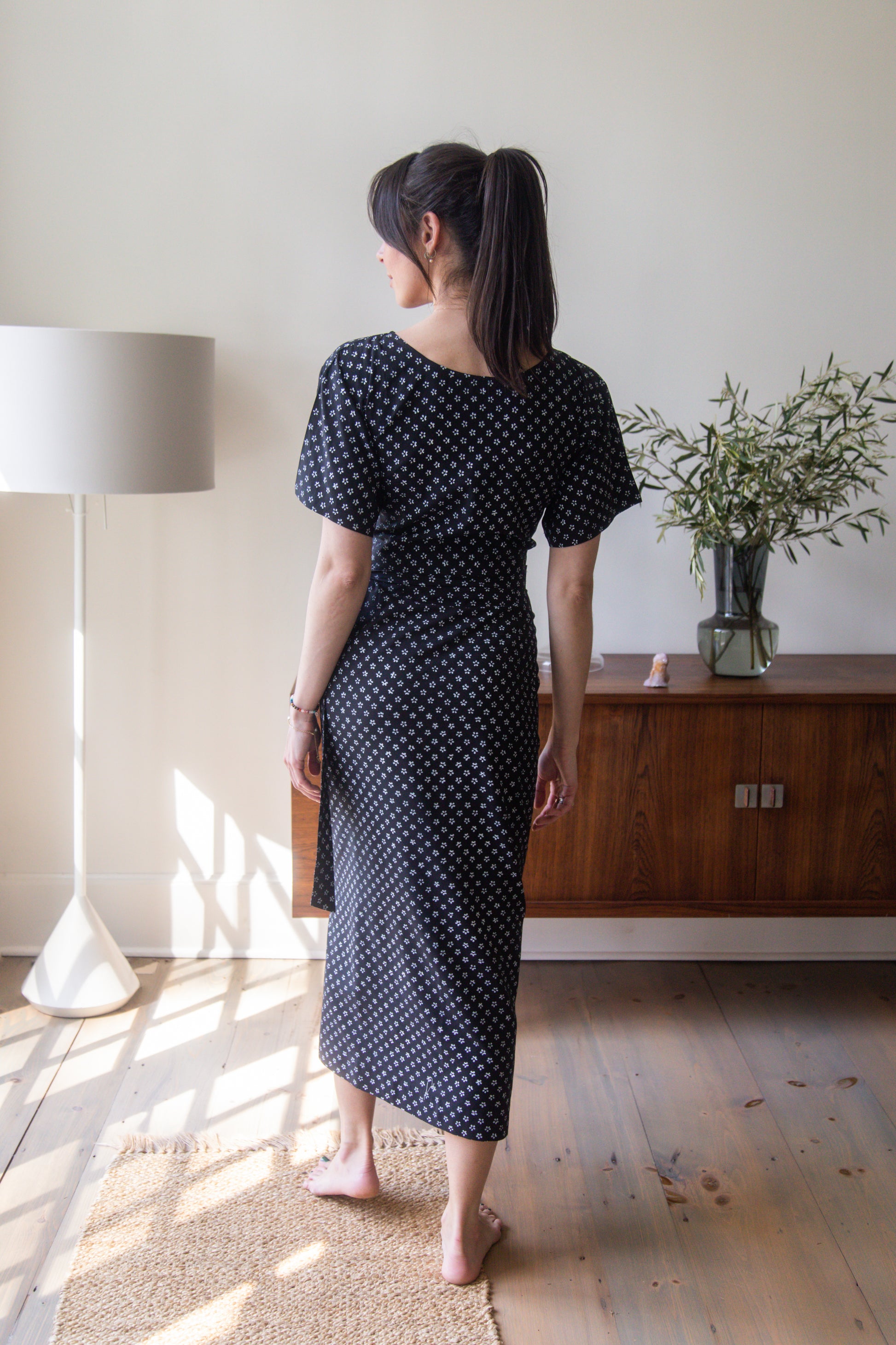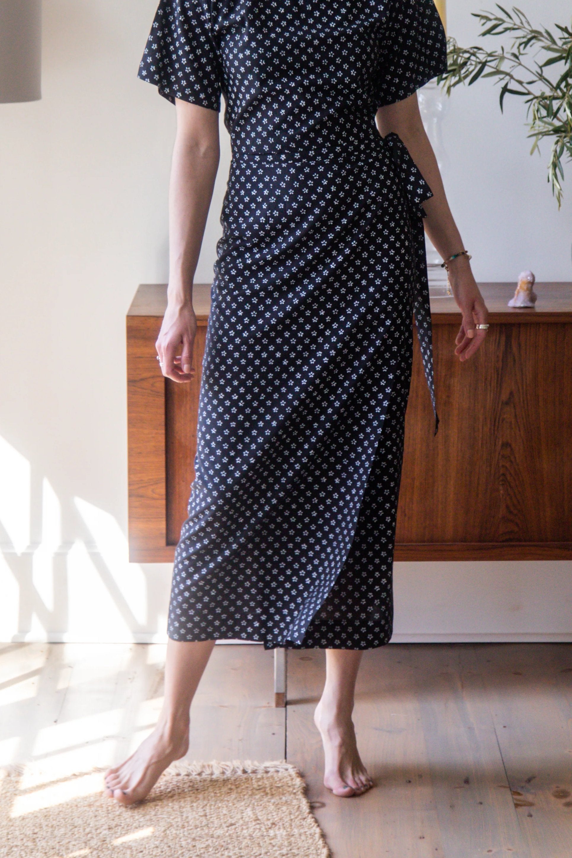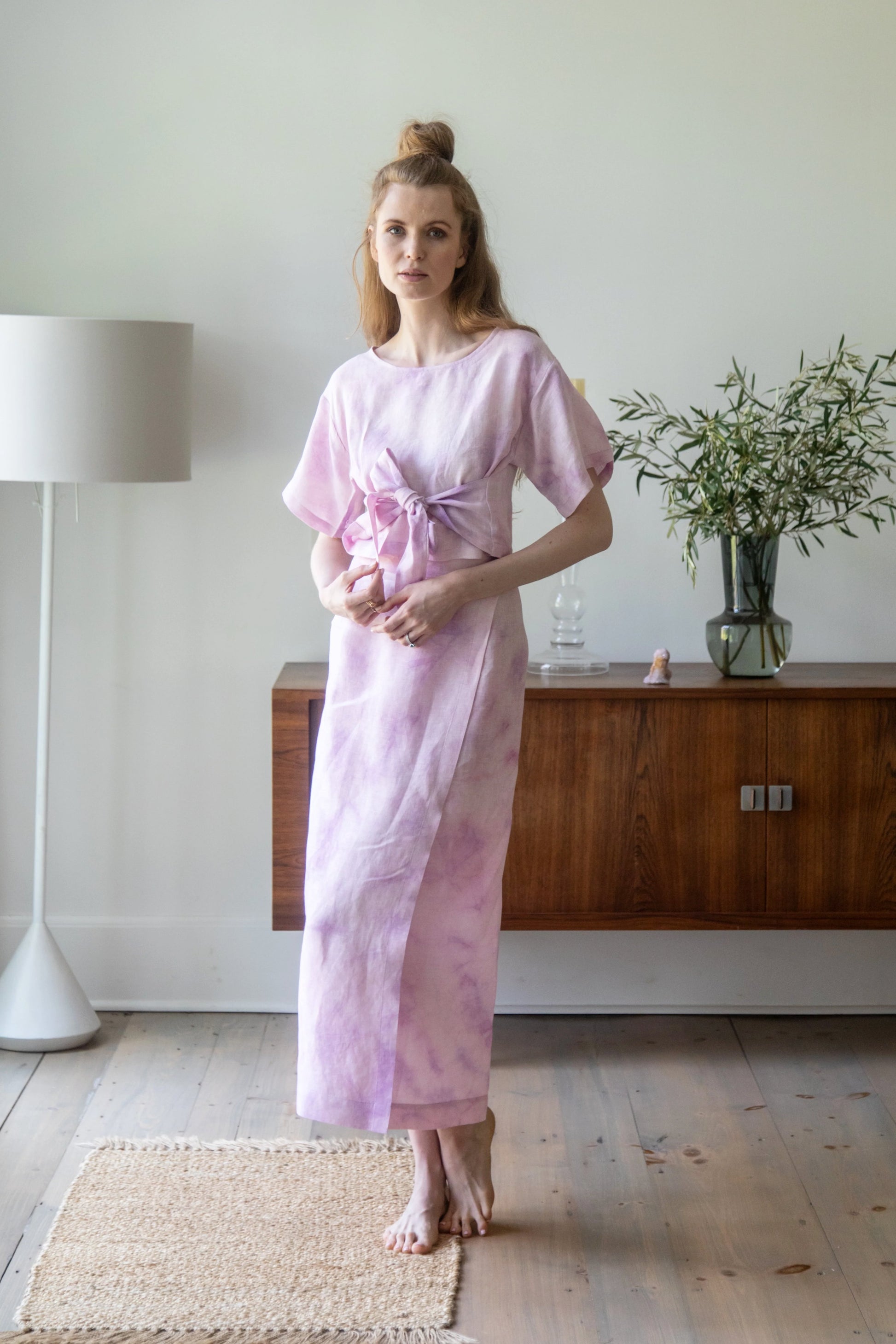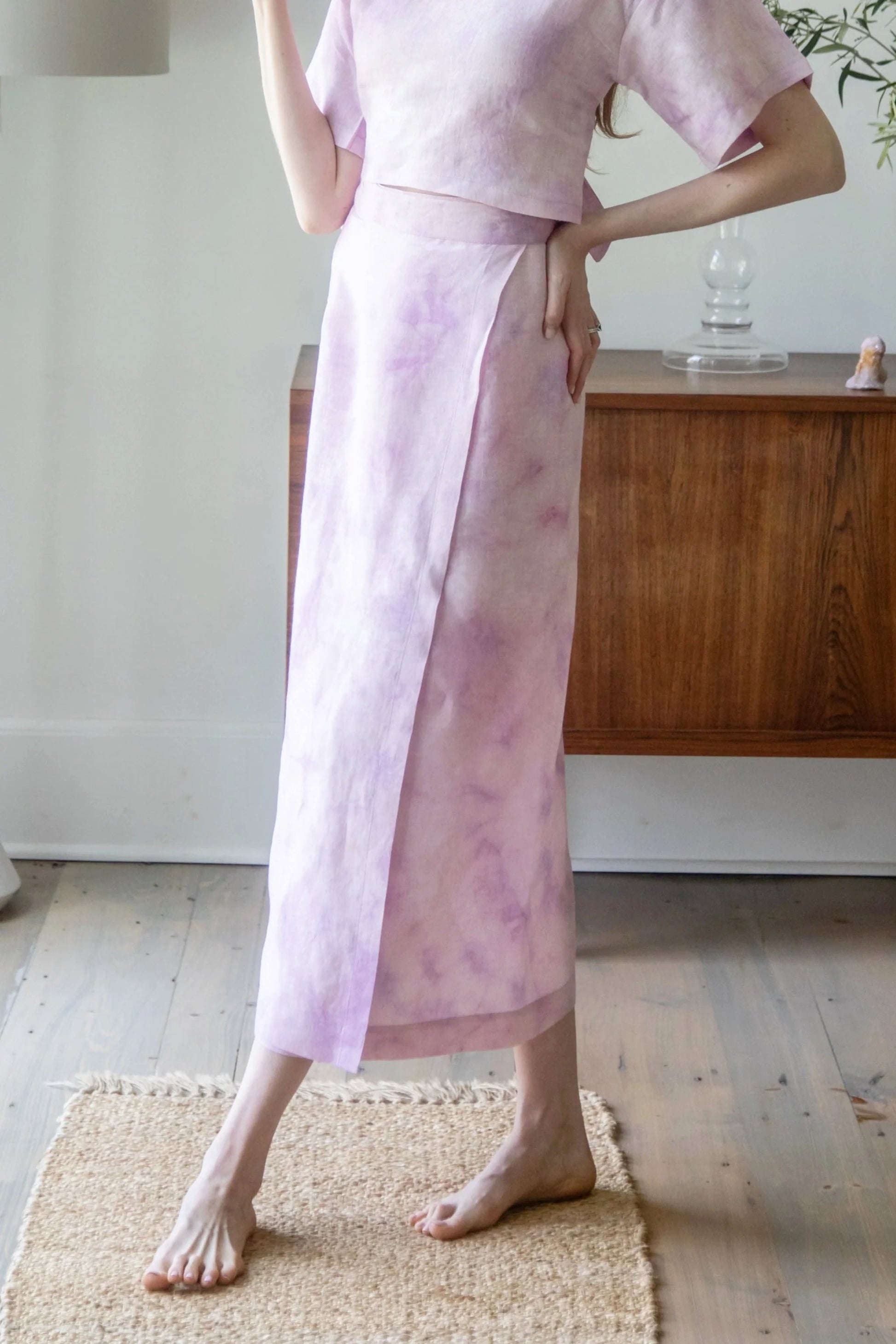 The wrap skirt is inspired by the chic look of a sarong at midi-length, creating a slimming column shape that flatters every-body. You'll love that the flexible sizing moves and evolves with your body. The top has a slight crop that ties in the front or the back, creating two entirely different looks.