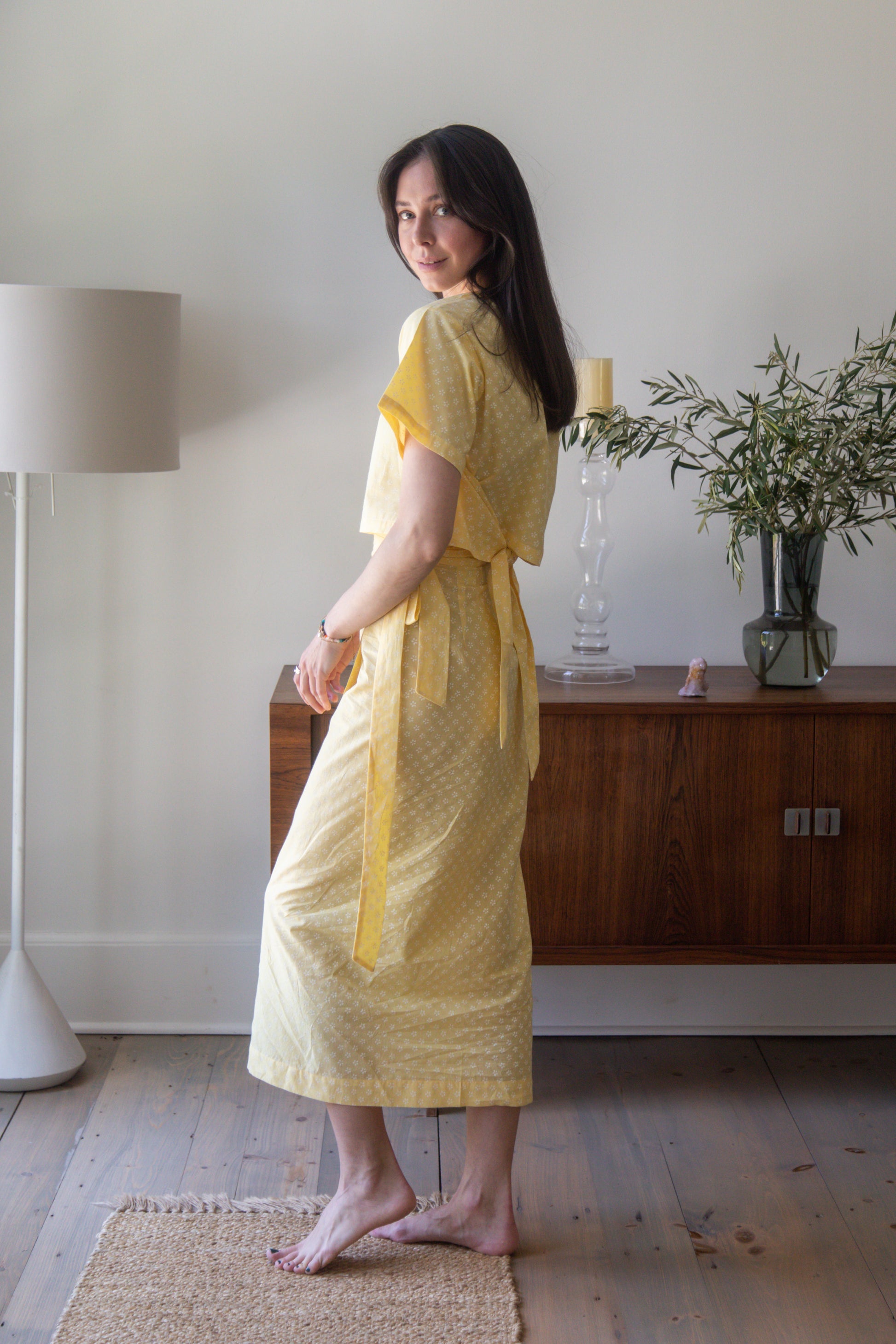 Out citron yellow ditsy print is block-printed by hand using an original wooden block from our artisans' collection in India. Mamas, don't miss the matching Bella Caftan for your mini.