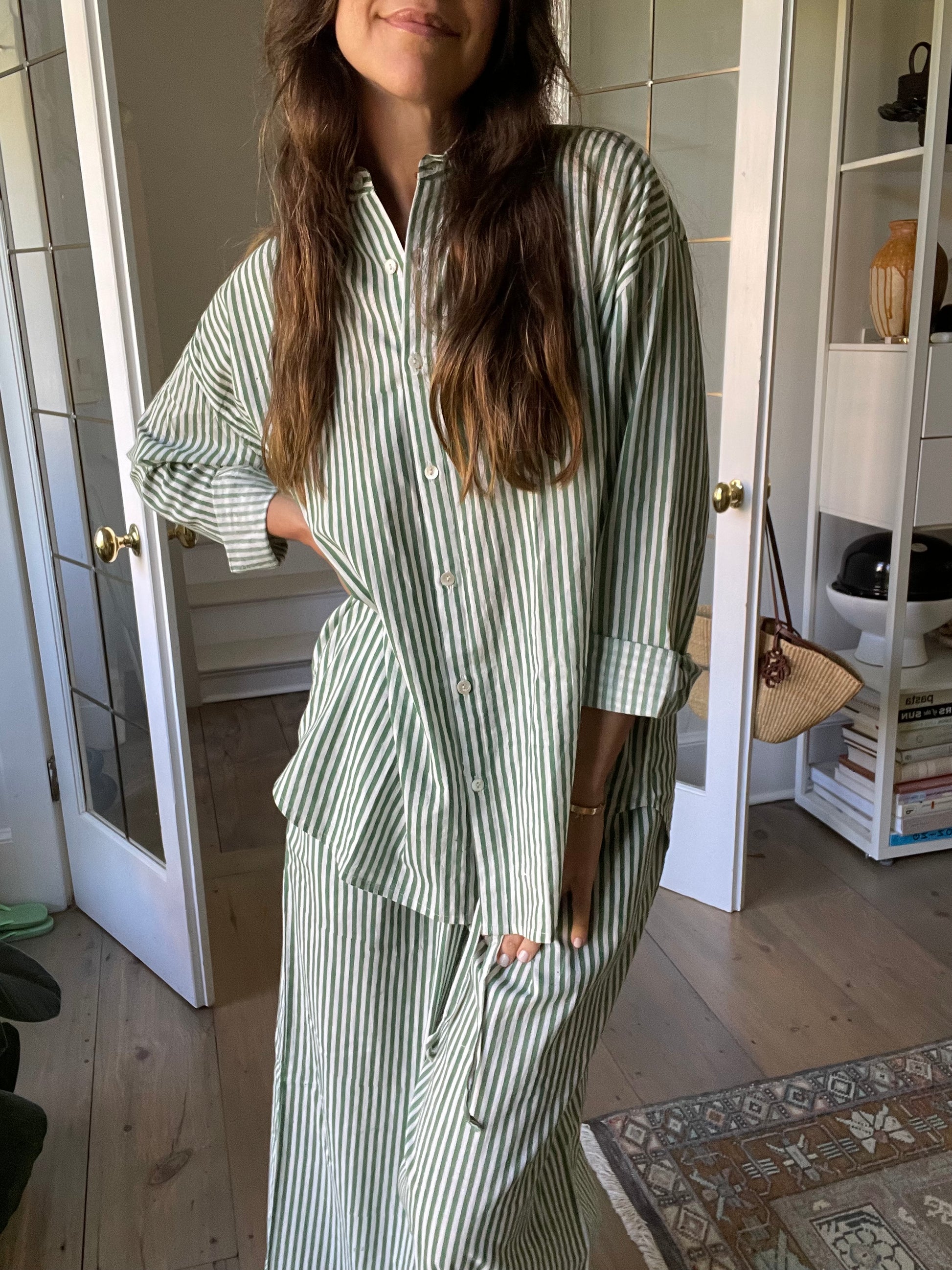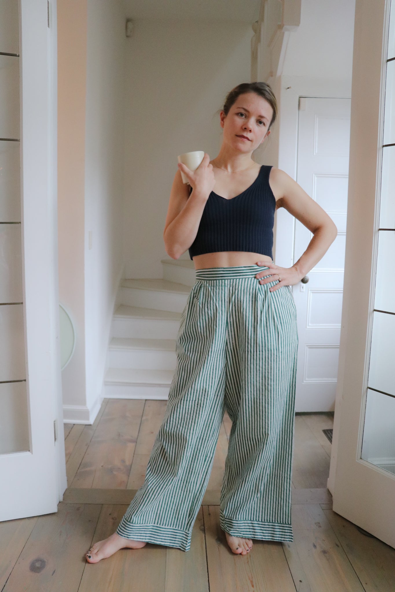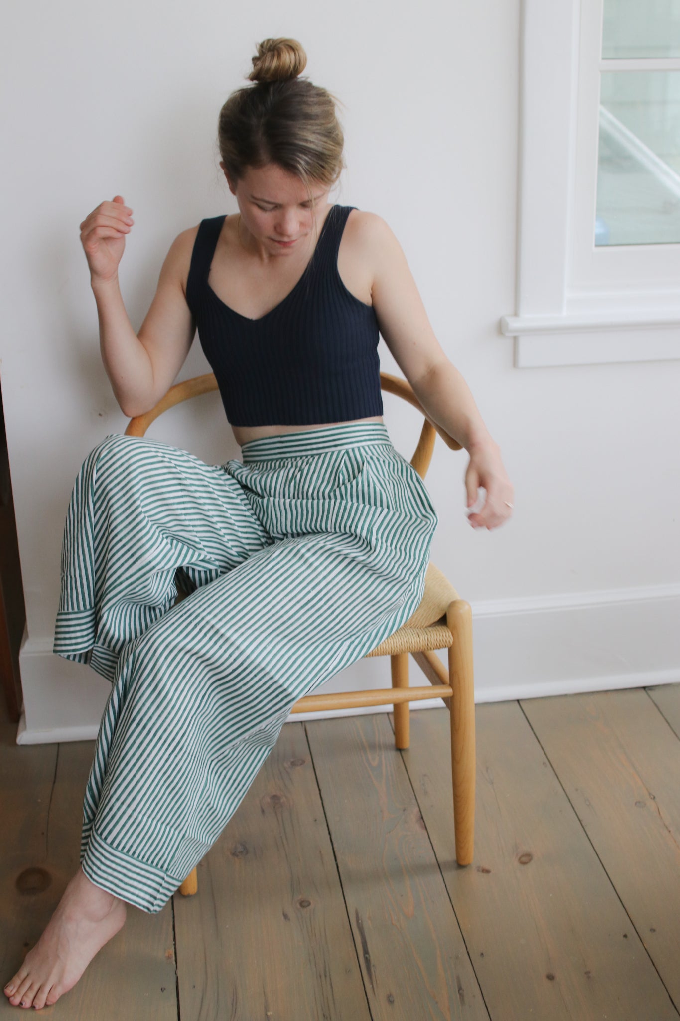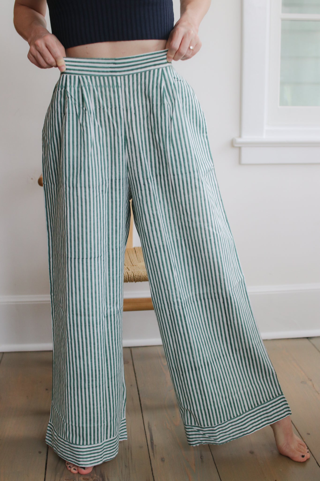 Chic, wide-leg pant with a slight crop. Relaxed yet flattering fit with elastic waist. Our emerald stripe is block-printed by hand on the softest organic cotton using natural dyes. Pairs with our matching Racquel Top for an elevated take on sweats or pajamas (that you can wear out of the house!), or wear it with your favorite tee, tank, or sweater.
