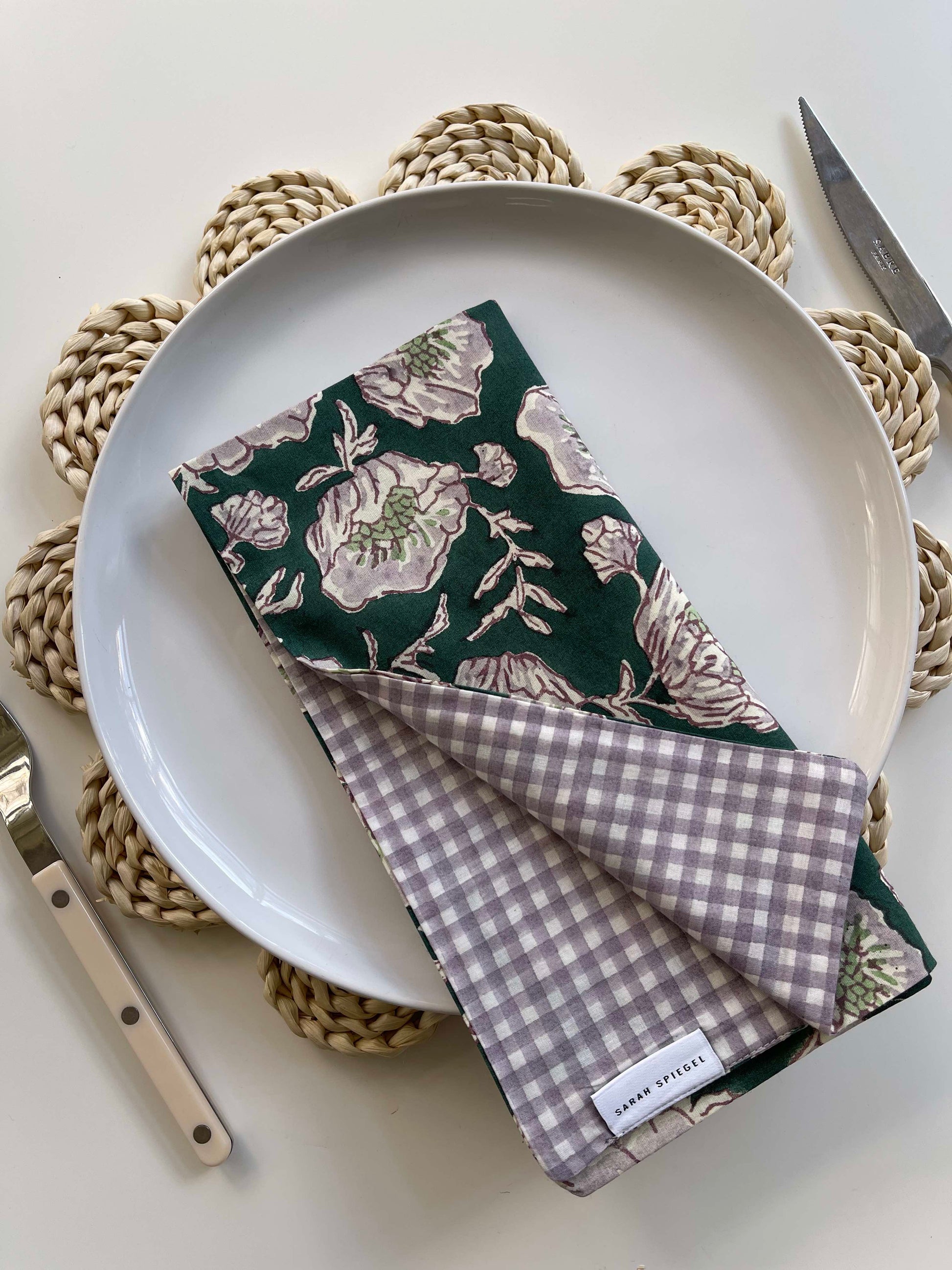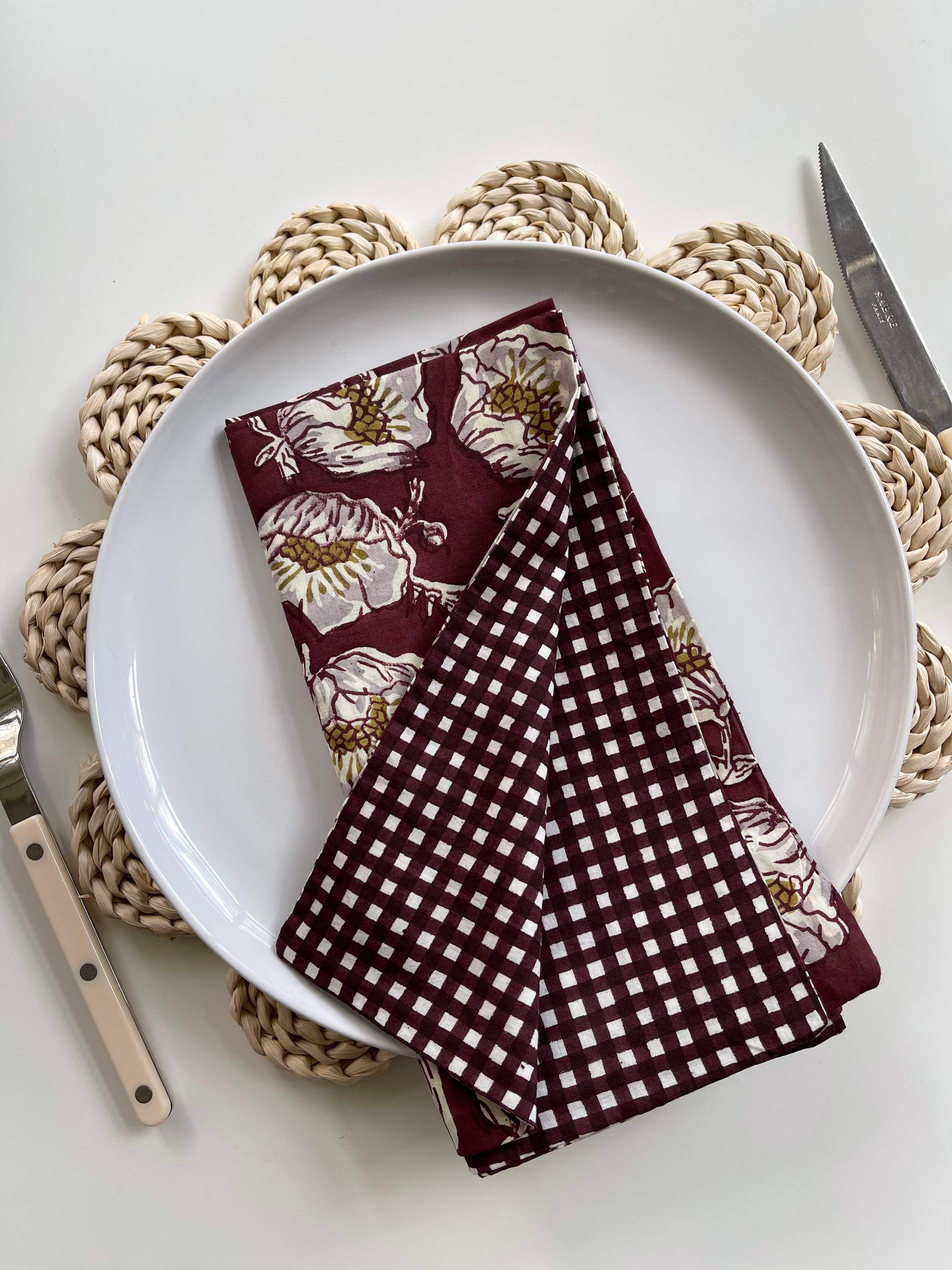 Why have one set of napkins when you can have two? Our reversible napkins have been designed in two coordinating floral print and gingham, all block-printed by hand using natural dyes.
