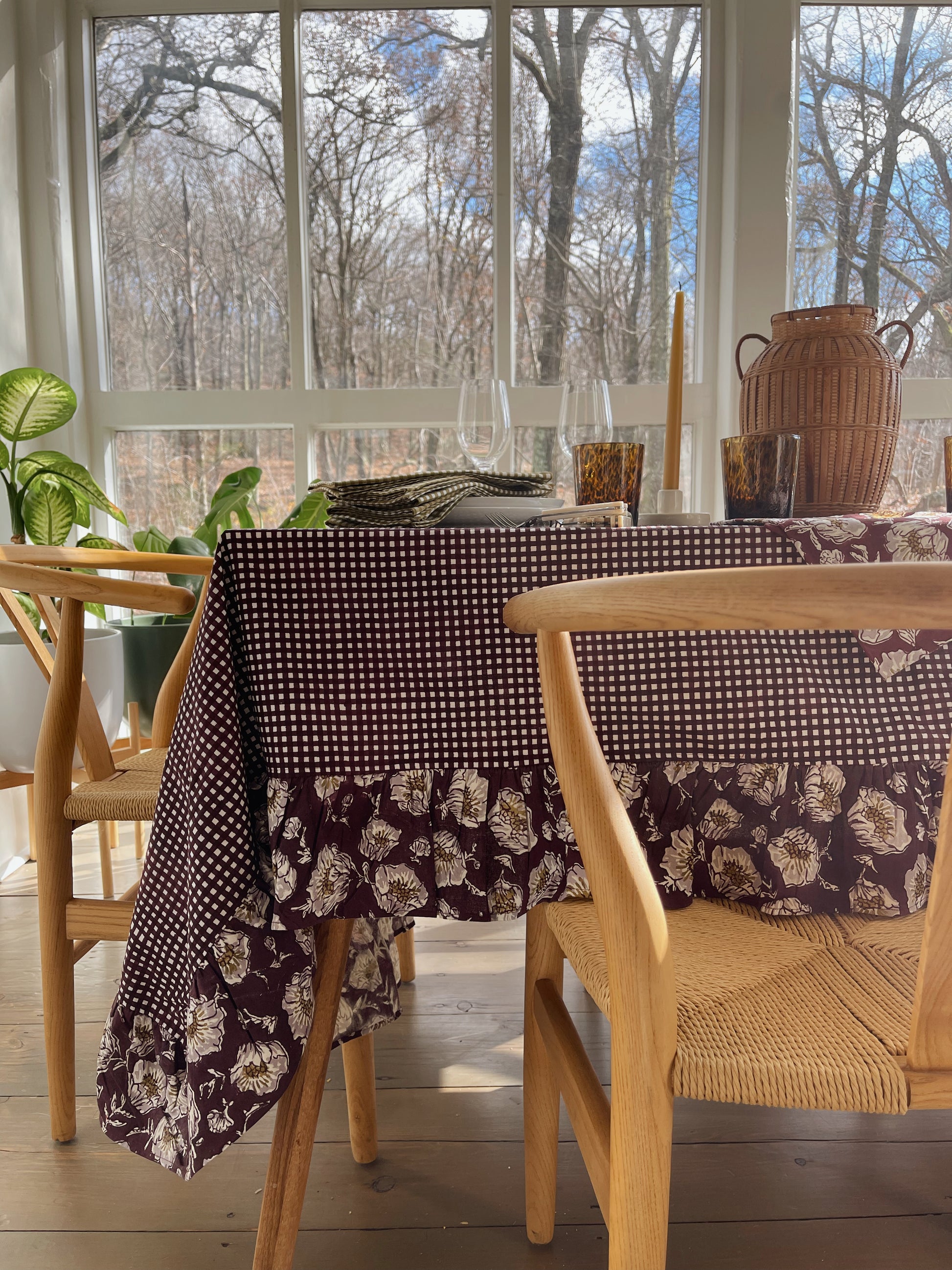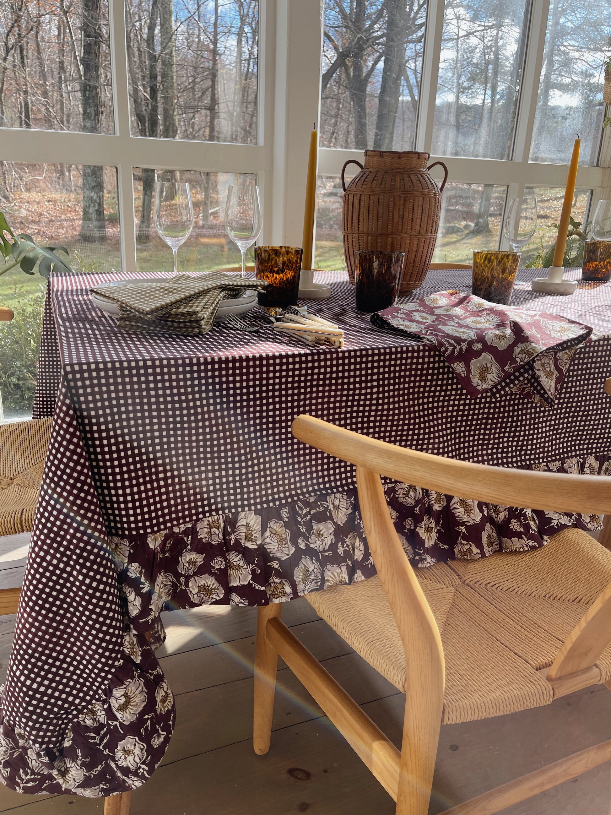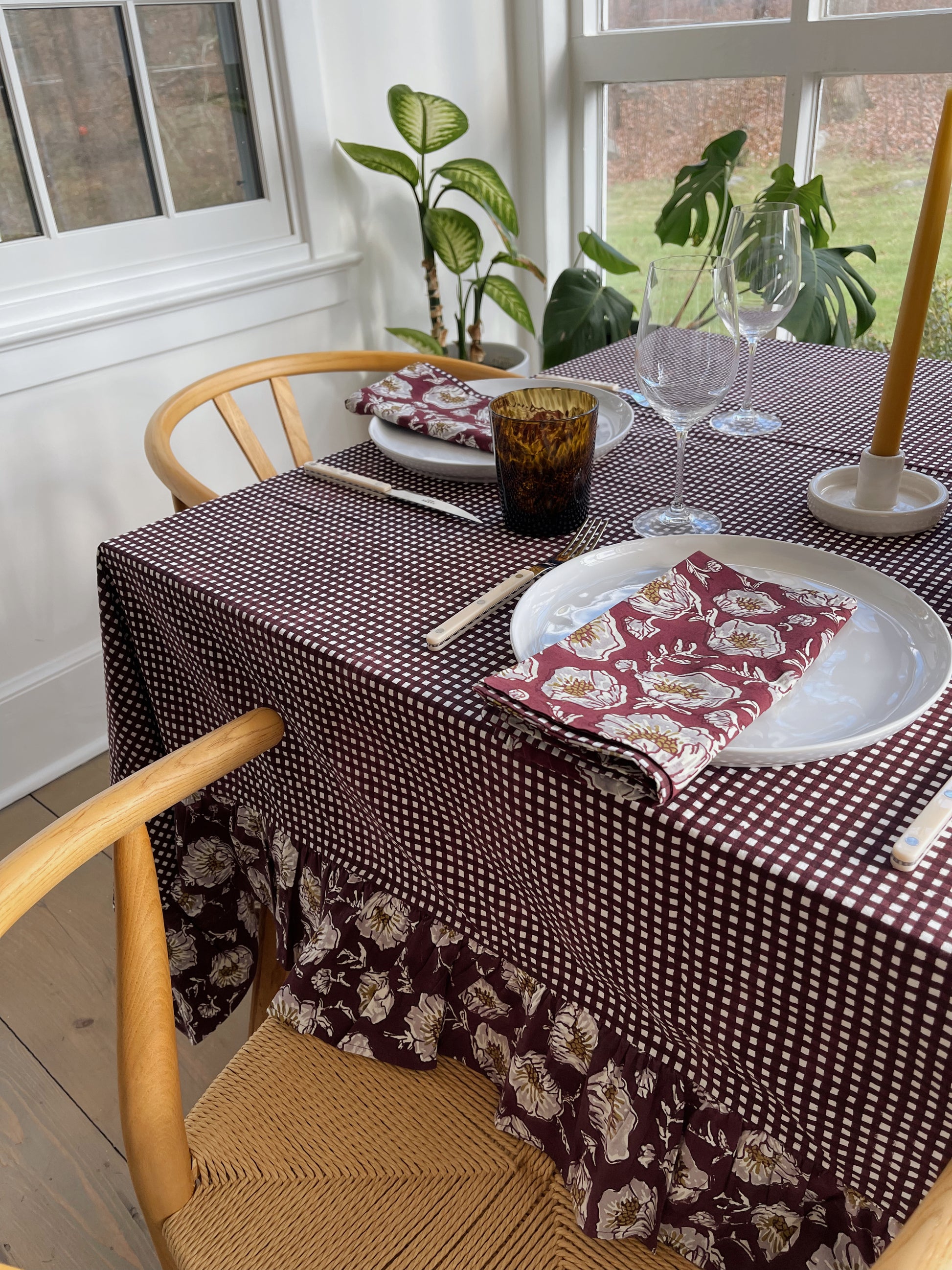 A showstopping tablecloth in rich wine-colored gingham and coordinating ruffle in our signature Wild Poppy print. All meticulously printed by hand using carved wooden blocks and natural dyes. Perfect for your holiday table, yet it also works year-round.