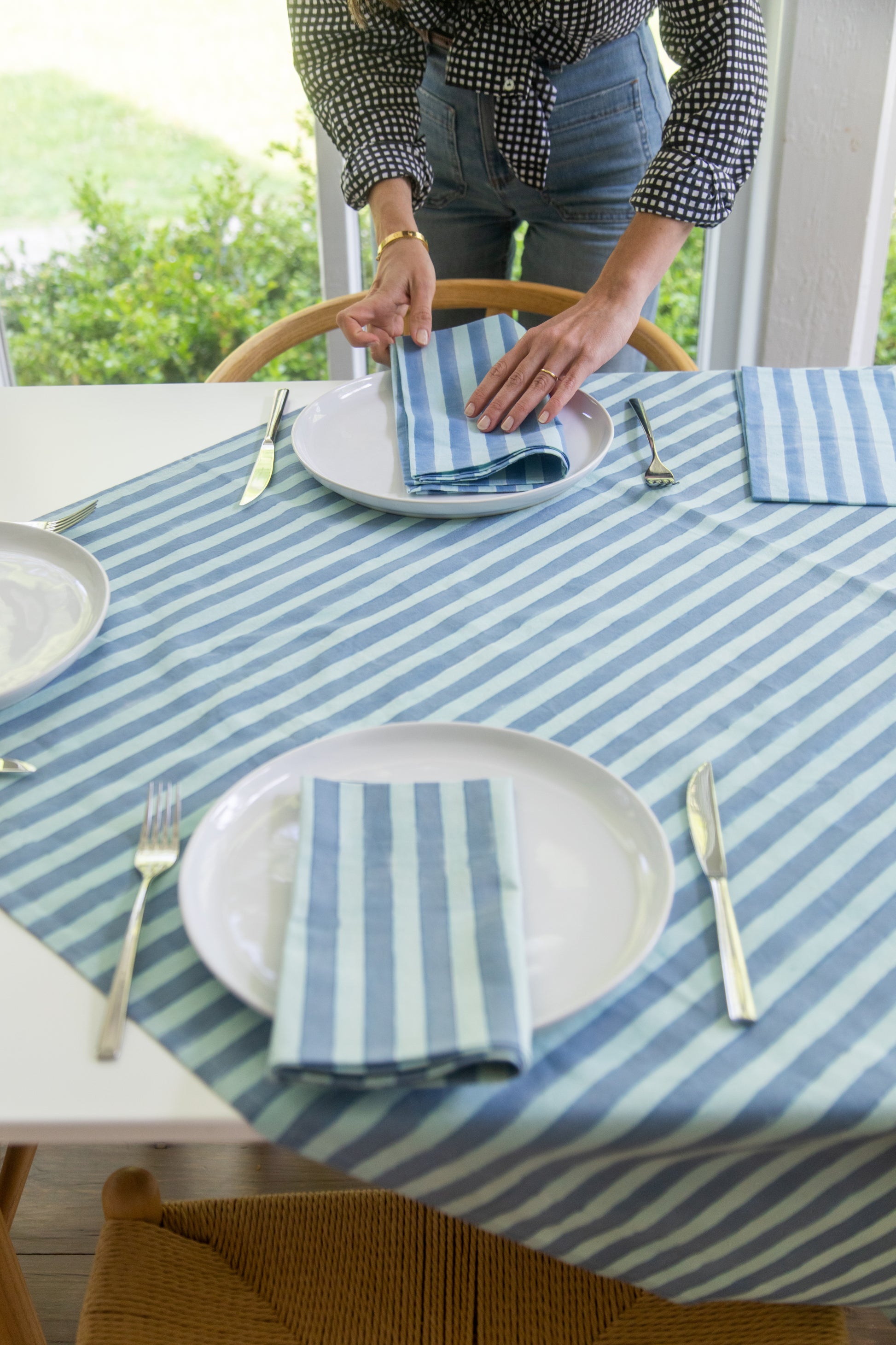 Bring on the summer blues. Our blue striped napkins are at once classic, modern, and fresh – and they will work in just about any space or decor style. Natural dyes in shades of deep chambray and serene sky blue are block-printed by hand on pure cotton, offering an effect of hand-painted stripes.